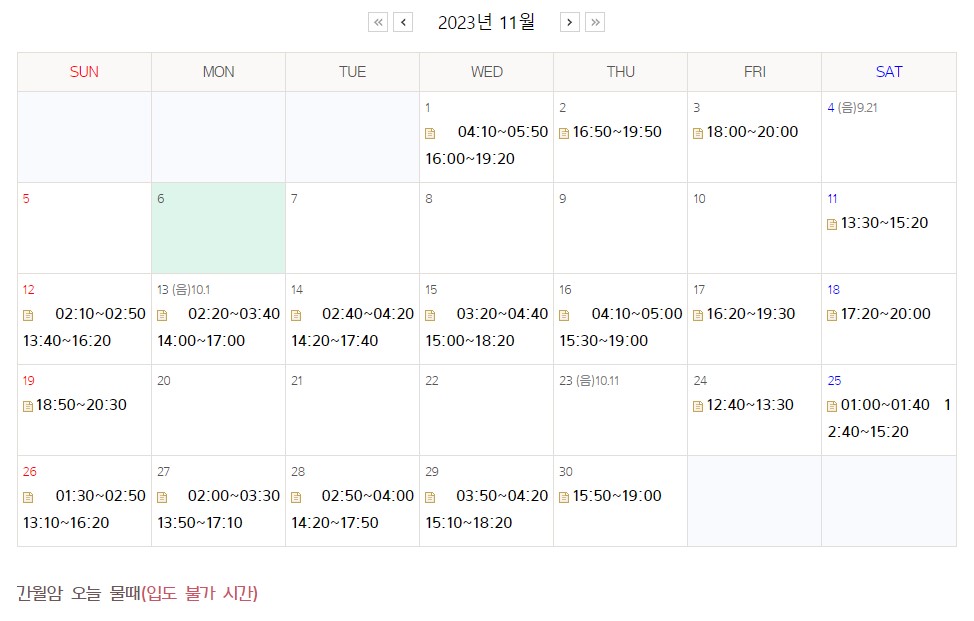 간월도 간월암을 방문하실 때에는 물때를 꼭 확인하시는 것이 필요합니다. 물의 수위가 높아지면 간월암에 들어갈 수 없으므로, 방문 전에 반드시 물때를 확인하셔야 합니다. 물때를 미리 파악하지 않고 방문하는 경우, 간월암까지 도달하지 못하게 될 수 있어서 큰 실망을 경험하게 될 수도 있습니다.