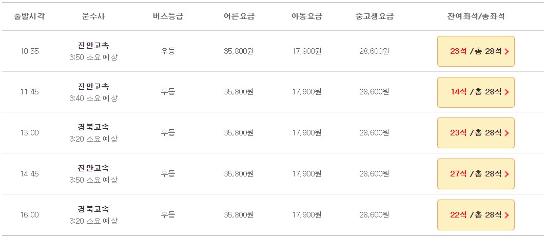 ● 성인: 우등 35,800원, 심야우등 39,400원