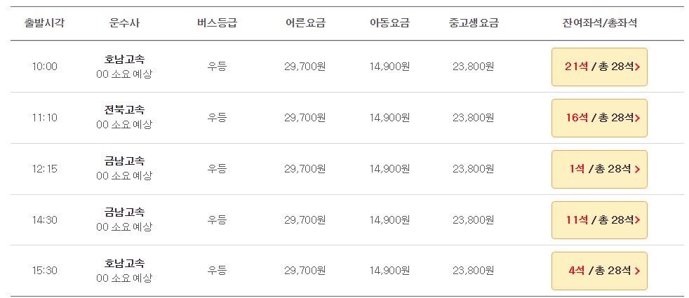 ● 성인: 우등 29,700원, 심야우등 35,600원