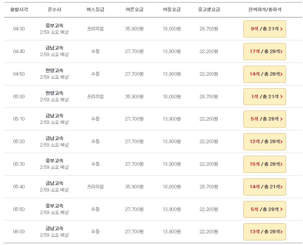 ● 성인: 심야프리 43,1000원, 프리미엄 35,900원, 심야우등 33,200원, 우등 27,700원