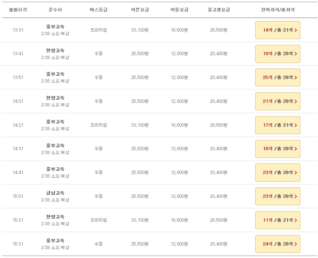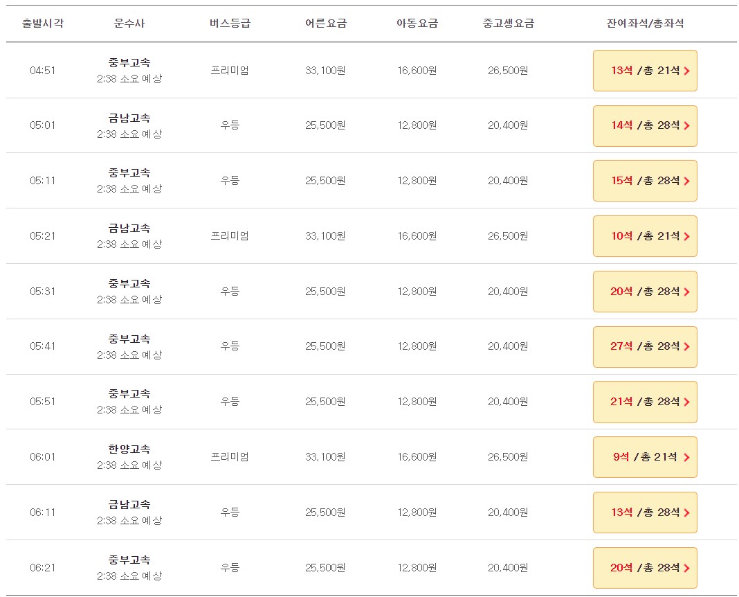 ● 성인: 심야프리 39,700원 / 심야우등 30,600원 / 프리미엄 33,100 / 우등 25,500원