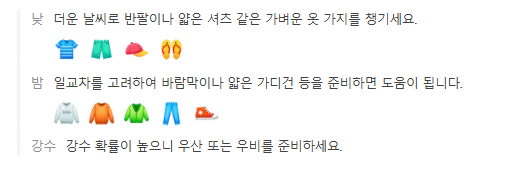 - 반팔, 반바지: 낮 활동에 적합
