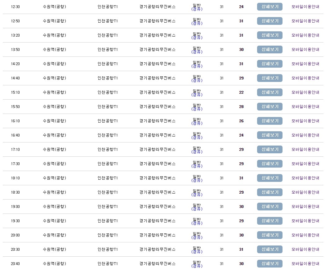 PC를 이용하여 예약하려면 버스타고 웹사이트에 접속하여 수원역에서 인천공항으로 가는 리무진 버스를 예매하세요. 아래 예매하기를 통해 바로 접속할 수 있습니다.