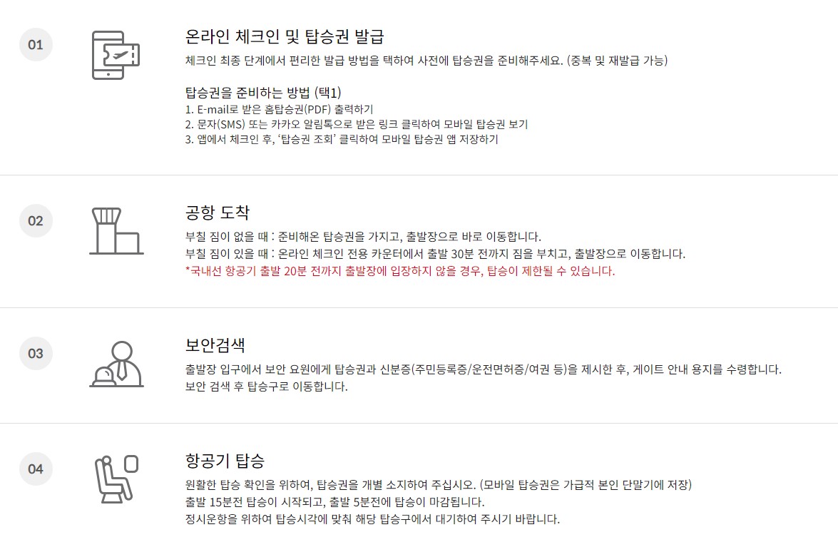 온라인 체크인은 총 4단계로 이루어져 있으며, 쉽고 간편하게 이용 가능합니다.