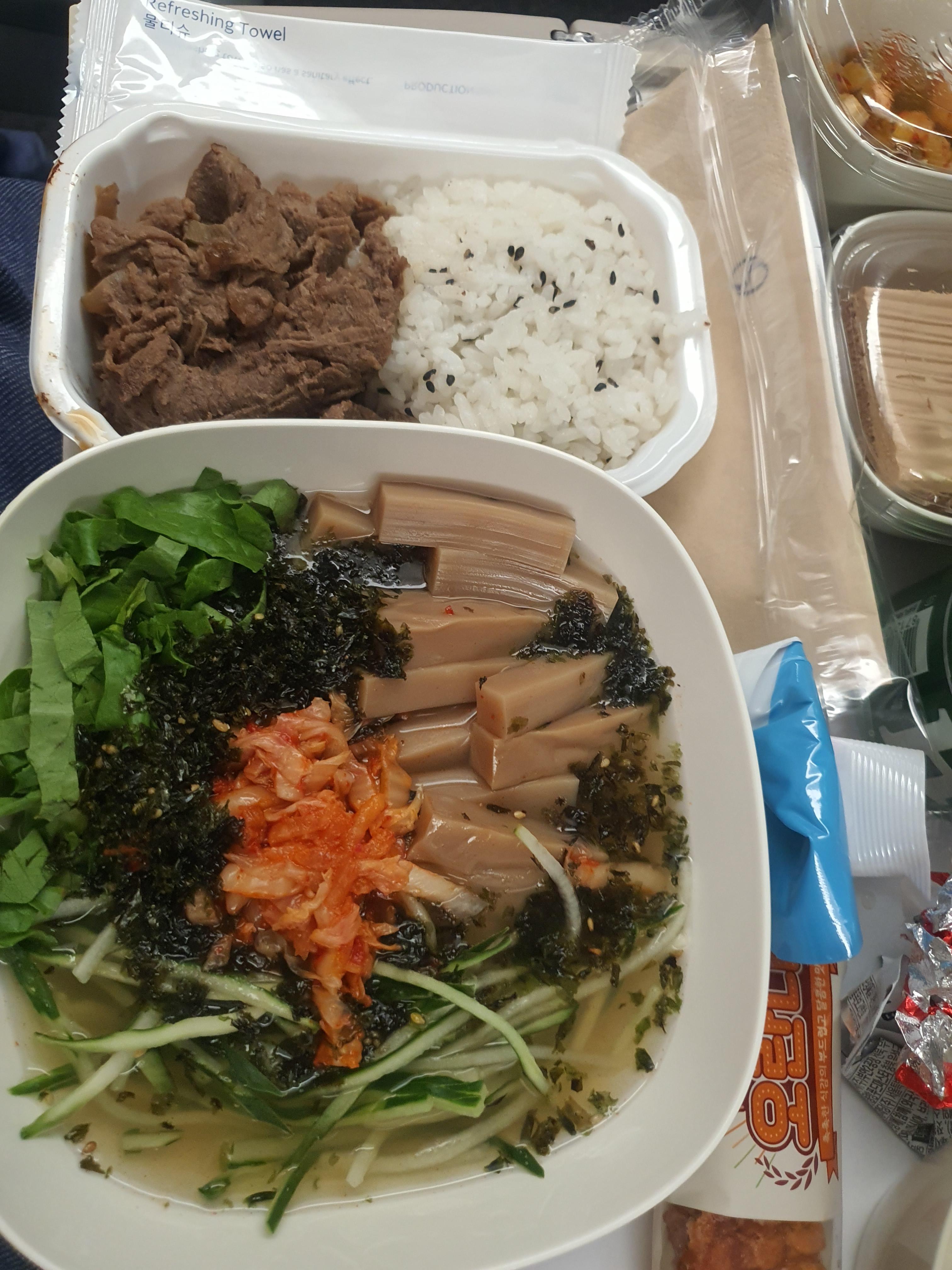 3가지 메뉴 중 이번 메뉴 선택은 소고기 요리와 묵밥이었는데, 평소라면 비빔밥을 고르지만 이번 비행에는 없어서 묵밥을 선택했습니다. 묵밥은 육수를 넣으면 의외로 맛이 심심해지기 때문에, 고추장을 곁들여 비빔밥 스타일로 비벼 먹는 방법을 추천드립니다. 이렇게 먹으면 기내식 특유의 밍밍함 없이 깔끔한 맛을 즐길 수 있습니다.