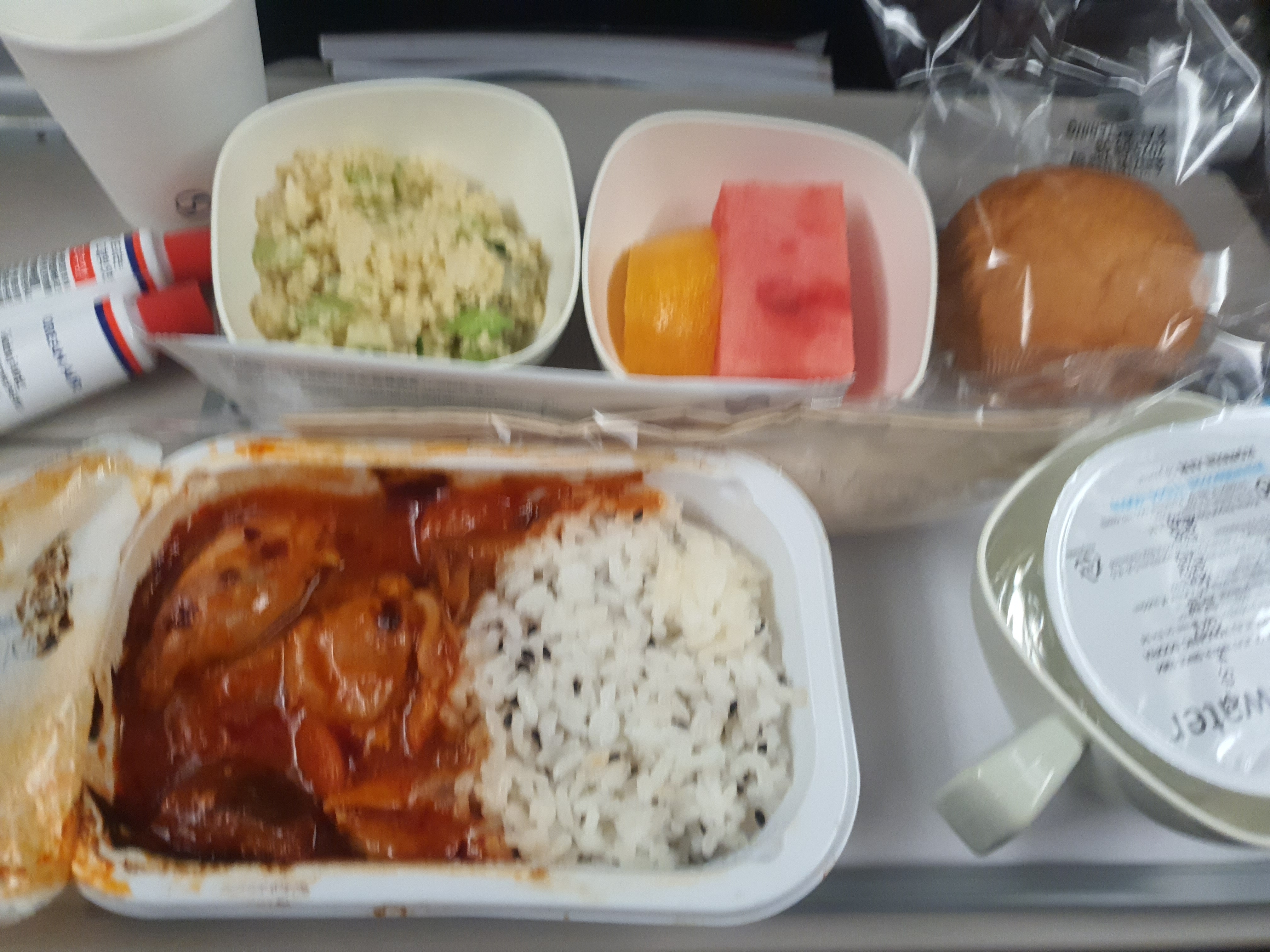 도착 약 2시간 전, 두 번째 식사가 나옵니다. 닭고기 요리 또는 스파게티 중 하나를 선택할 수 있었는데, 배가 불렀지만 도착 후 저녁 식사가 없다는 걸 생각해 억지로라도 먹었습니다. 장거리 여행에서는 도착 후 일정이 곧바로 이어질 수 있으니, 가능한 먹어두는 게 좋습니다. 스파게티보단 닭고기 요리가 더 맛있었어요.