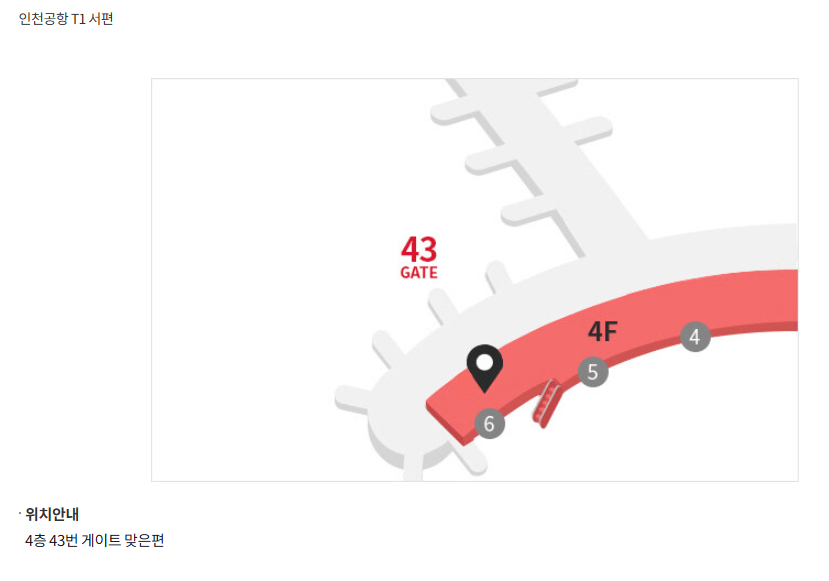 ● 위치 안내 : 제1터미널에 위치한 현대면세점 인도장은 보안 검색대를 통과한 후, 면세구역으로 이동한 뒤 찾을 수 있습니다. 특히, 4층에 있는 43번 탑승구 맞은편에서 현대면세점 인도장을 확인할 수 있습니다.