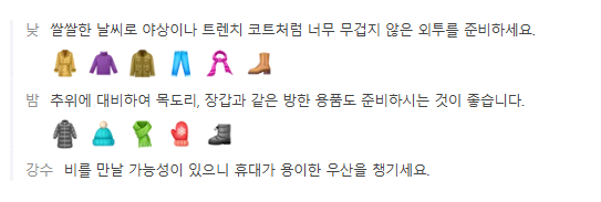 - 상의: 히트텍과 같은 기능성 내의 위에 두꺼운 스웨터, 기모 맨투맨, 후드티 등을 겹쳐 입는 것이 좋습니다.