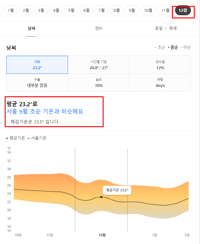 A1. 평균 기온 23~27℃로 시원한 겨울 날씨이며, 낮에는 반팔 옷차림이 적합합니다.