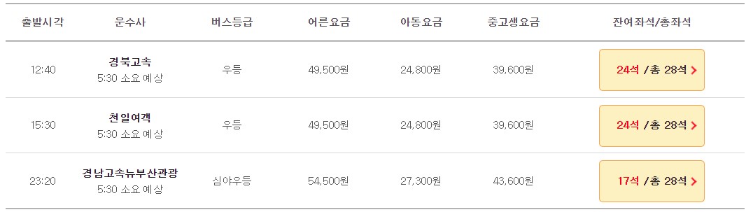 ● 성인: 우등 49,400원, 심야우등 54,300원