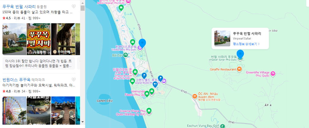 - 빈펄 사파리 푸꾸옥 (Vinpearl Safari Phu Quoc): 동남아시아 최초이자 유일한 오픈 동물원으로, 약 3,000마리의 희귀 동물들을 만날 수 있습니다. 사파리 버스를 타고 동물들을 가까이에서 관찰하는 특별한 경험을 할 수 있습니다. 푸꾸옥의 잊지 못할 경험이 될 것입니다.
